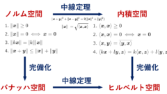 完備なノルム空間をバナッハ空間といいますが,完備な内積空間をヒルベルト空間 (Hilbert space) といいます。空間としては,以下のような関係です。