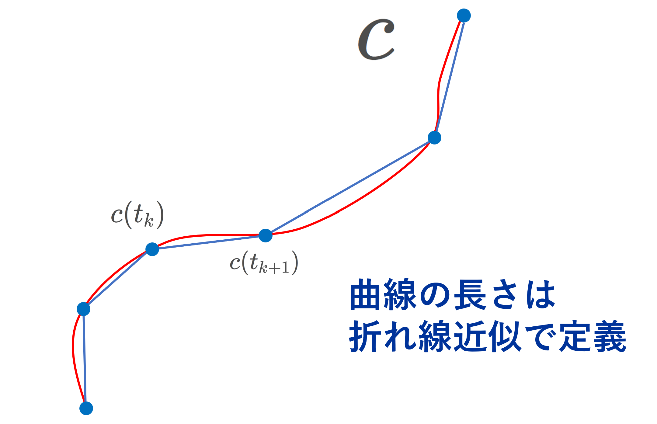 要するに,折れ線近似で曲線の長さを定義しているわけです。折れ線の分割を細かくすればするほど,折れ線の長さは大きくなっていき,曲線の長さに近づいていきます。