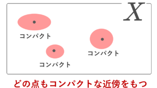 は A の開被覆となるが,有限部分被覆が存在しないので, A のコンパクト性に矛盾する。よって赤字は示せた。