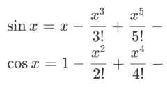 - \small \displaystyle \sin x = x - \frac{x^3}{3!} + \frac{x^5}{5!} - \dots + (-1)^n \frac{x^{2n+1}}{(2n+1)!} + \cdots, \,\, (|x|<\infty).