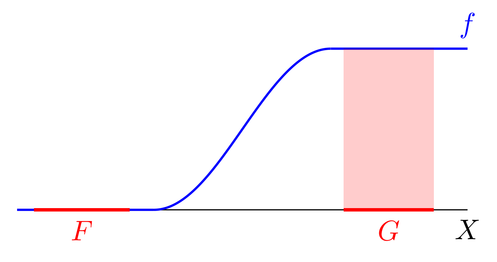 2.\implies 1.は, f^{-1}([0,1/3)), f^{-1}((2/3,1]) とすれば,これはそれぞれ x, F の開近傍になっています。逆が成立しないことは今は紹介しません。